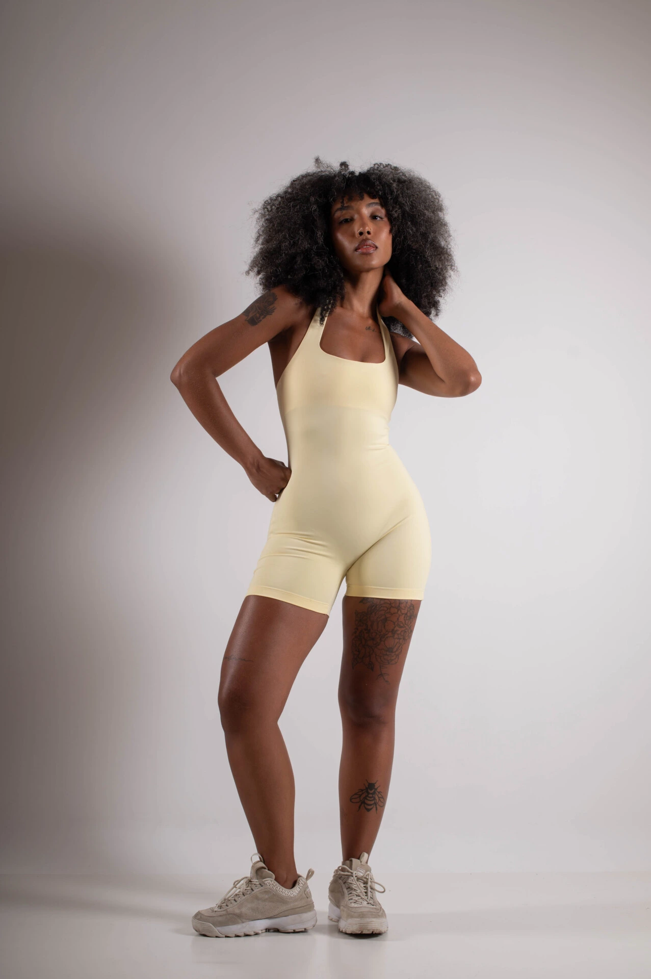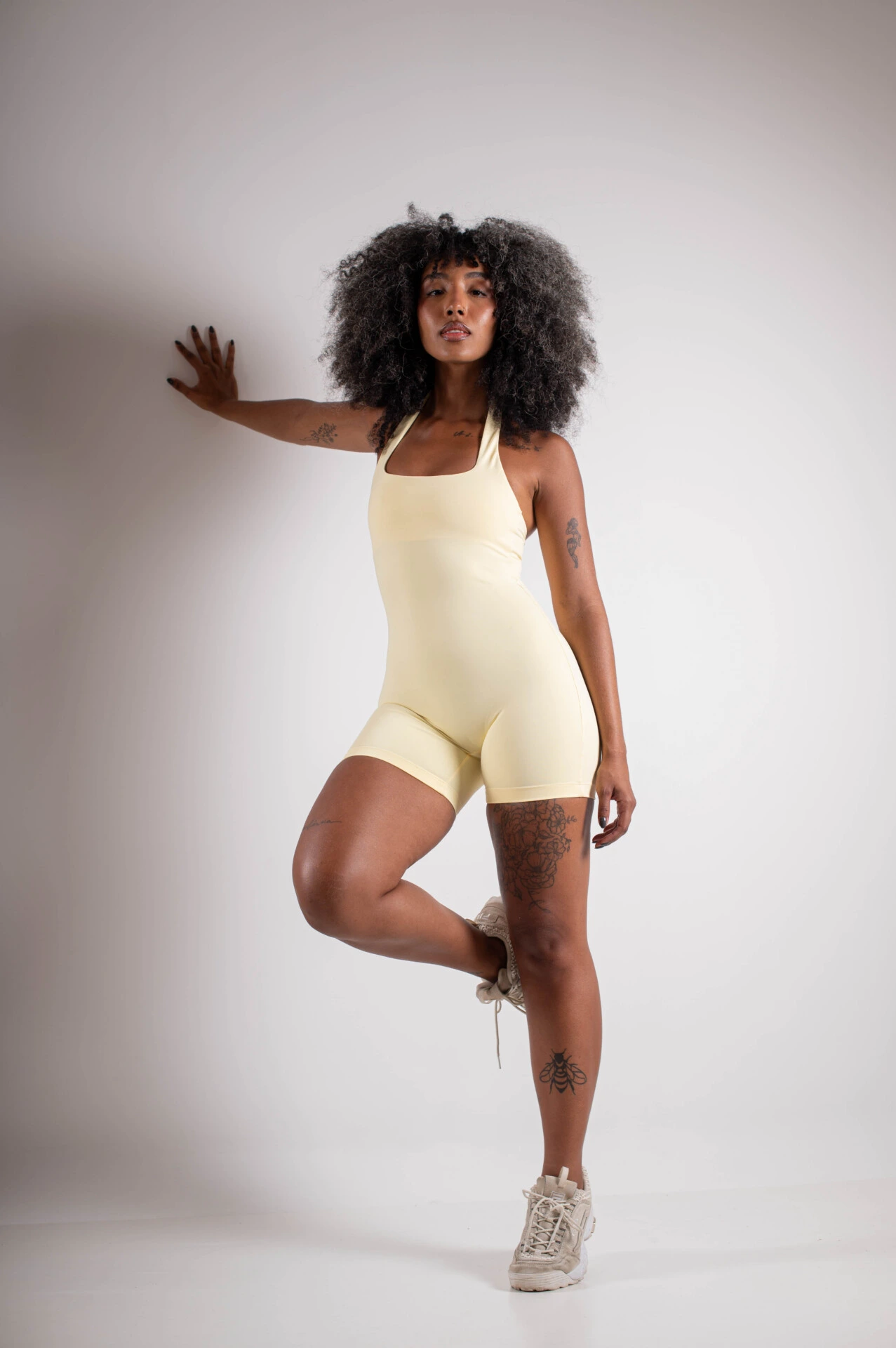 Macaquinho divo com modelagem justa que valoriza e desenha o corpo, trazendo um visual moderno e elegante. O decote halter com alças largas destaca os ombros e o colo, criando uma silhueta feminina e sofisticada.